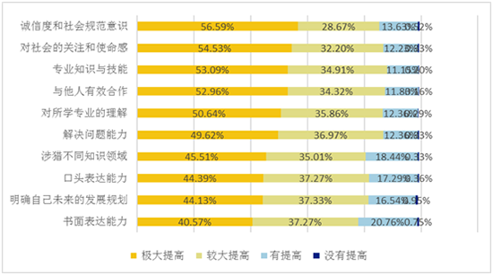 四年的时光,在第一课堂、第二课堂、师生互动的教学情景中,学生们感受到变了模样,被赋予了人生中一些重要的东西。“我在母校成长为了一个平静质朴且善于思考的人,这一点我感到很满意,也很感恩”,“在专业知识、思维方式和处世之道上都有所领悟”,“四年时间过的很快,从迷茫到憧憬,过的充实,有意义,感谢母校带给我的一切”,“母校使我拥有了人生的第一笔财富,一笔由知识品格和信念构筑的精神财富”,“充实的四年,我从一个懵懂的学生,眼界变得更开阔”……