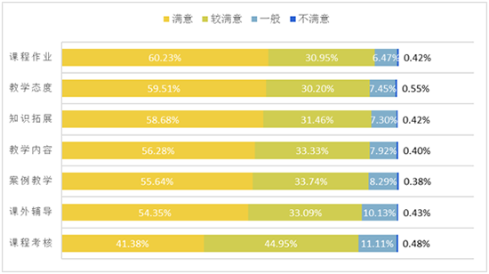 近几年,学校根据学科发展趋势和人才培养需要,不断修订和完善人才培养方案,在对200门专业主干课的调查中,85.94%的同学对所学专业表示肯定和满意,毕业生的高认同率从实践层面证实了学校专业建设和课程建设与培养目标定位的达成度。其中,同学们对教学过程各环节表示满意和较满意的同学人数都超过了80%,表现出较强一致性的满意度。